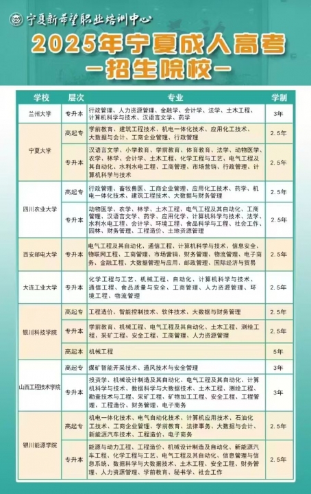国家开放大学,26年春季招生中, 高起专,专升本,免试入学,学制两年半,入学就有学籍,学信网可查 ,26年成考预报名,报名只交145元考试费,即可报名领取资料欢,迎咨询报读 任老师:*****6378(微信同号) 地址:吴忠富康商务中心